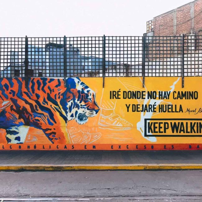 Este hermoso mural creado por «La Chata» está inspirado en símbolos y elementos de la cultura Mochica, representativa de su ciudad natal. Los patrones textiles y accesorios nos llevan a una diosa que con su seguridad y empoderamiento que no deja de ser percibida.